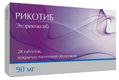 Рикотиб – нестероидный противовоспалительный препарат, который продается в дозировке 60 мг, 90 мг. Основное действующее вещество – эторикоксиб, которое отличается высокой эффективностью, низкой частотой побочных эффектов, хорошей переносимостью. Если вас интересует, сколько стоит препарат Рикотиб, это можно узнать, перейдя на сайт одной из онлайн-аптек ниже на странице. Стоимость лекарства зависит от концентрации действующего вещества и количества таблеток в упаковке.